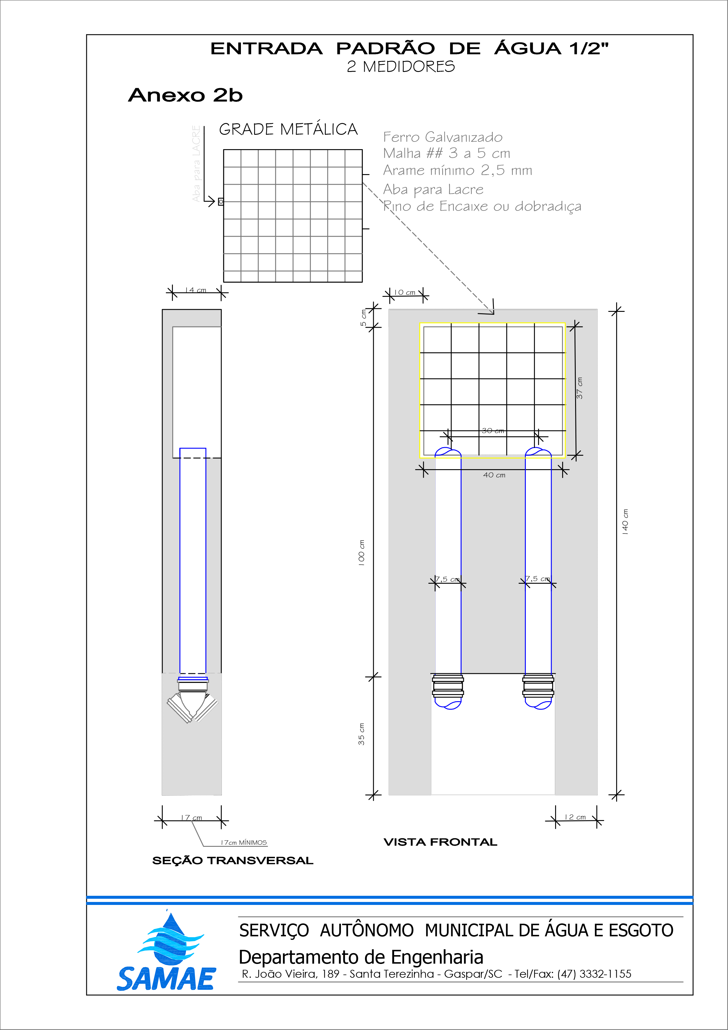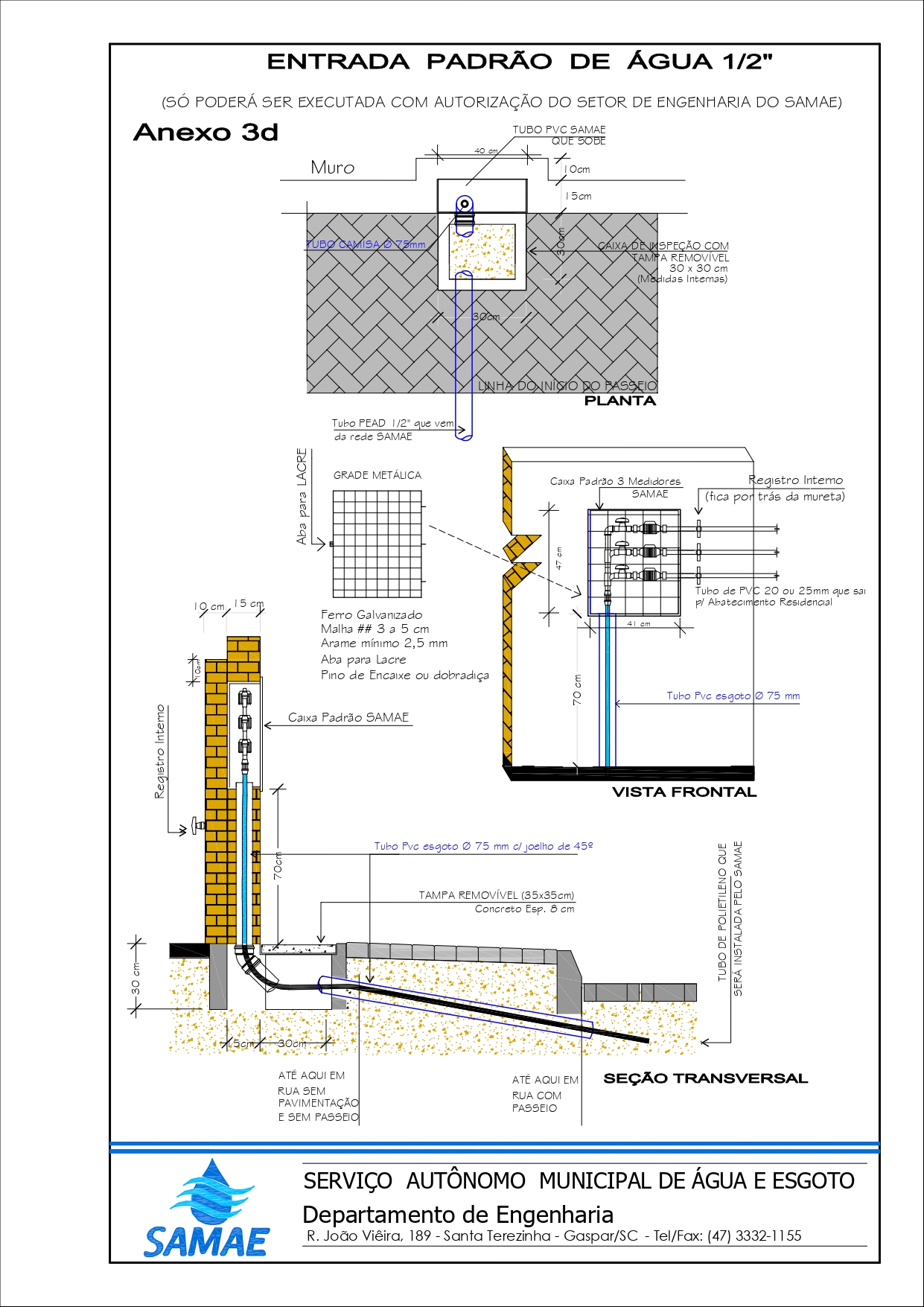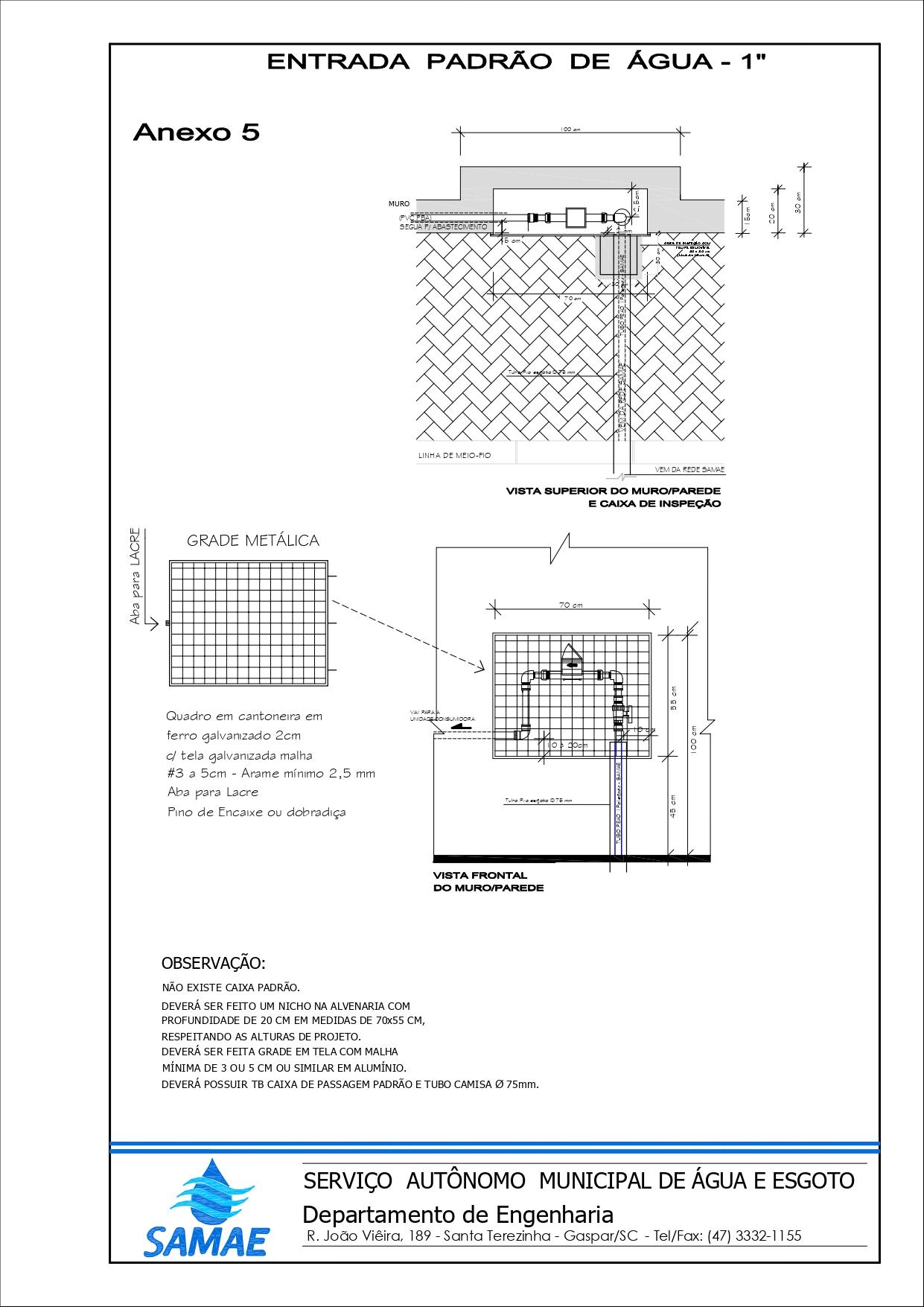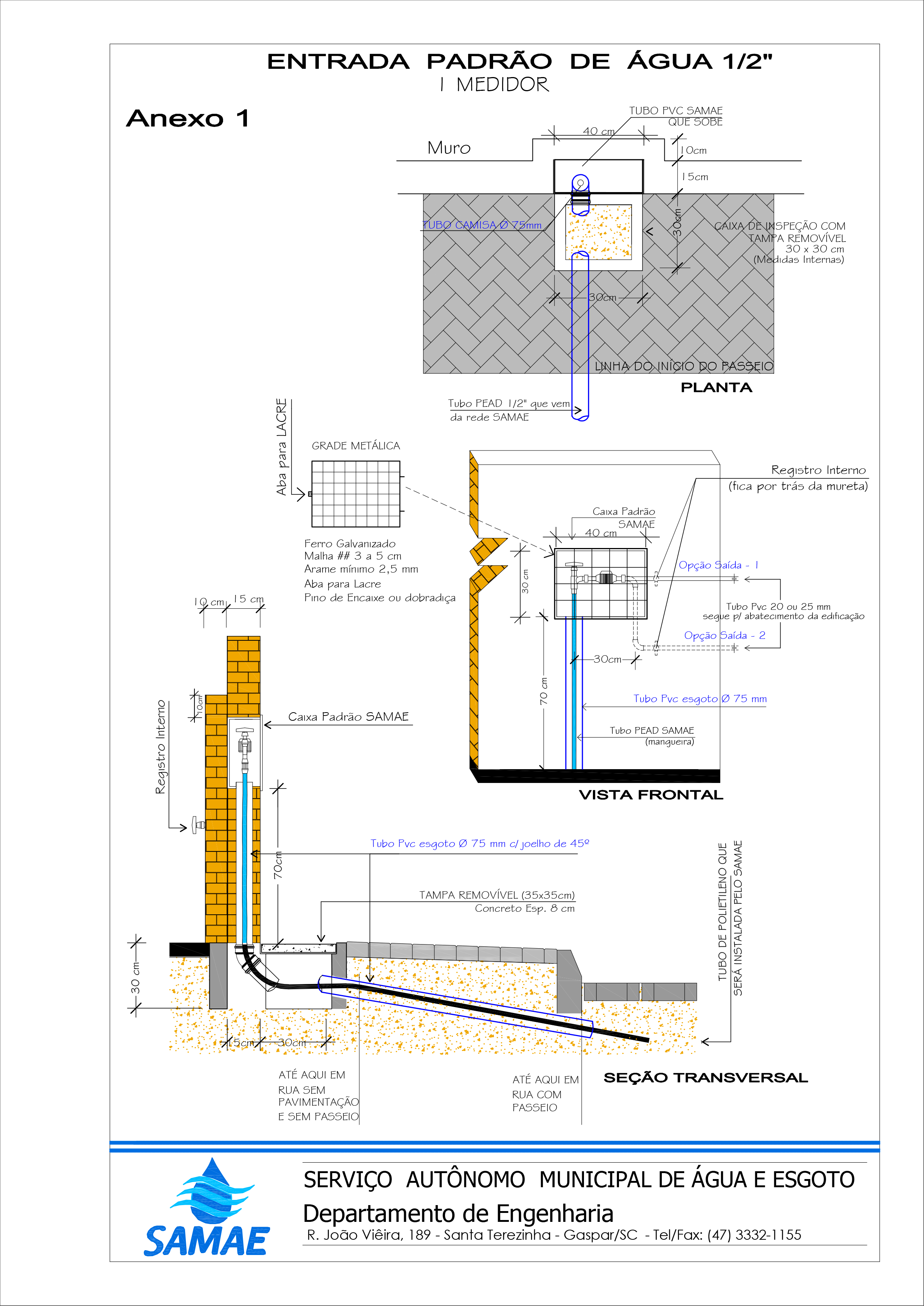 O Samae de Gaspar adota um Padrão de Ligação de Água com o objetivo de facilitar a manutenção e leitura dos hidrômetros. Além disso, o Padrão oferece mais segurança aos consumidores, pois protege os hidrômetros contra estragos, vandalismo, furto ou quebra no cavalete.