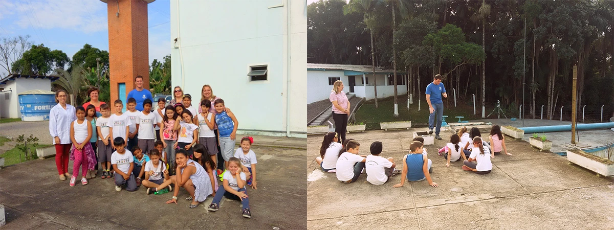 Guiados por um operador da ETA, os estudantes fazem uma visita técnica pelas unidades de tratamento, aprendendo sobre cada etapa do processo: desde a captação da água no rio Itajaí-Açu até os procedimentos de coagulação, floculação, decantação, filtração, desinfecção, reservação e distribuição.