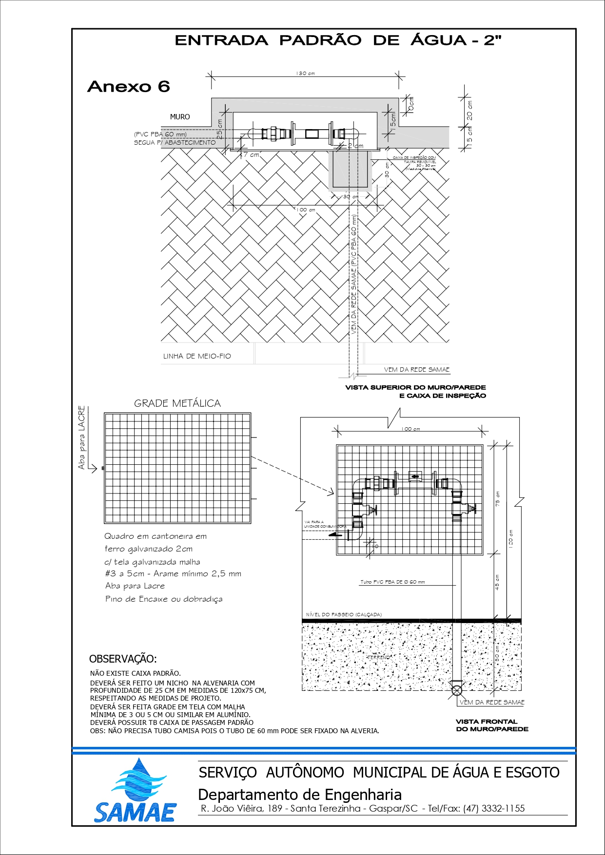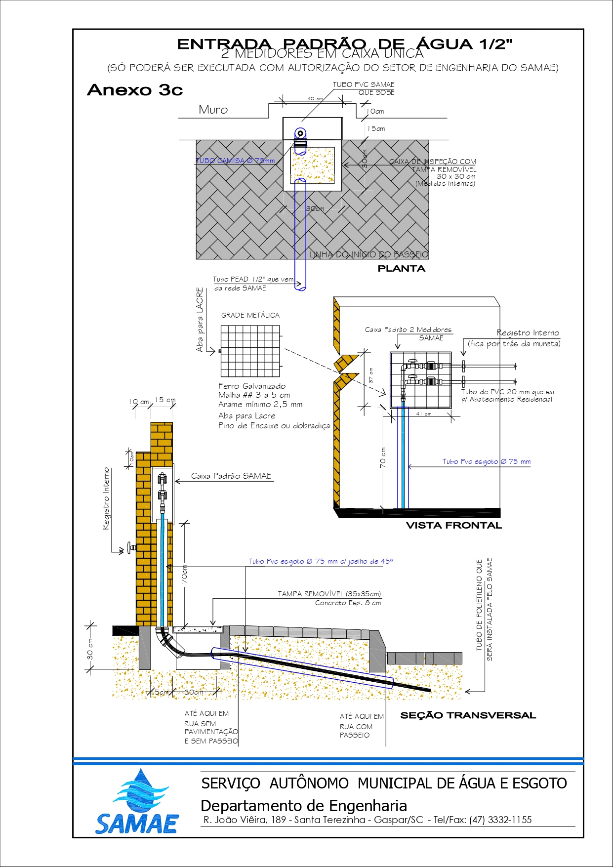 O Samae de Gaspar adota um Padrão de Ligação de Água com o objetivo de facilitar a manutenção e leitura dos hidrômetros. Além disso, o Padrão oferece mais segurança aos consumidores, pois protege os hidrômetros contra estragos, vandalismo, furto ou quebra no cavalete.
